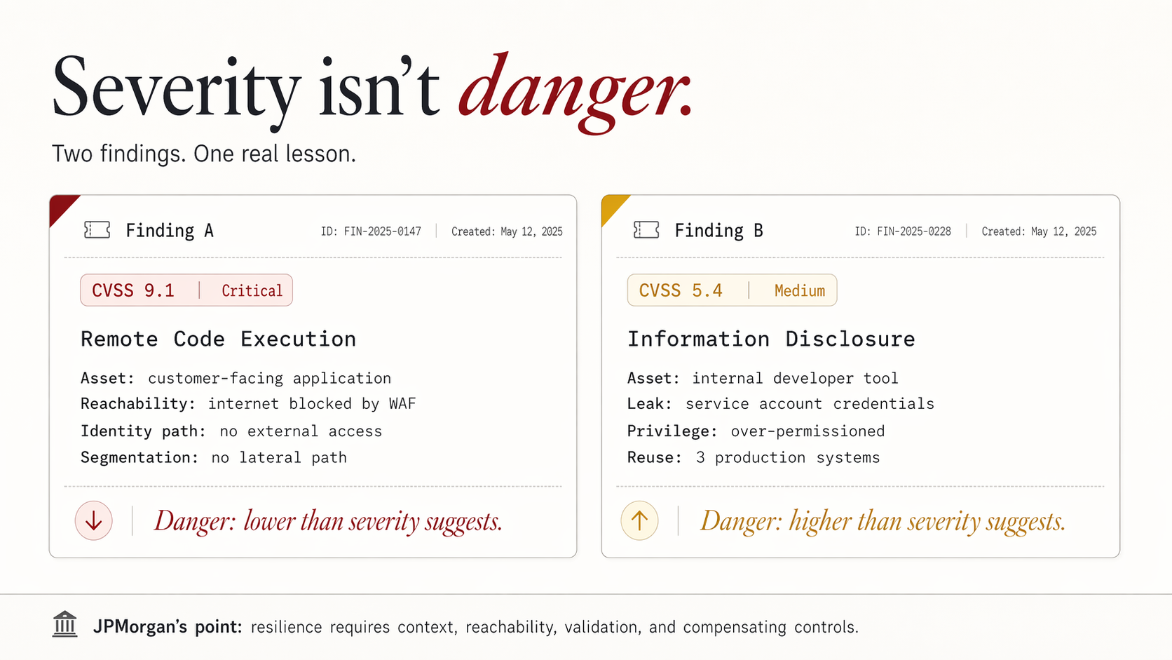 This is the gap. Severity scores, measured in isolation, misranks risk in both directions. JPMorgan's call for correlation across asset criticality, application context, reachability, and exploit availability is the only way to close it.