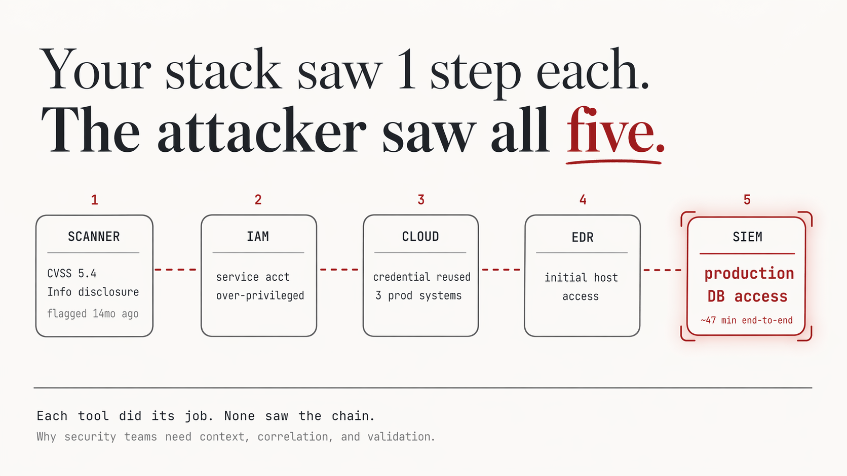 Detection, exposure, and identity tools operate in silos. The EDR sees process behavior. The SIEM sees logs. The vuln scanner sees CVEs. The IAM system sees entitlements. Correlating across them to answer "does this exposure plus this identity weakness plus this misconfiguration create a viable attack path?" is a human job done in spreadsheets, Jira tickets, and Slack threads.