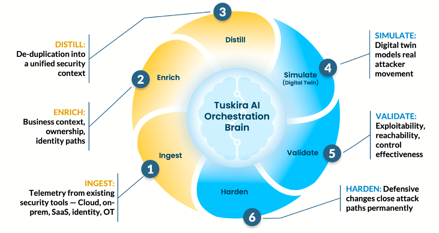 Tuskira was built around this architectural premise. We ingest telemetry and context from existing security investments, including SIEM, EDR, cloud platforms, identity systems, AppSec tools, CMDB, and third-party integrations. That data is distilled into a unified security context that models: